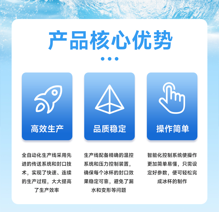 生產(chǎn)線配備精確的溫控系統(tǒng)和壓力控制裝置,確保每個(gè)冰杯的封口效果穩(wěn)定可靠,避免了漏水和變形等問(wèn)題。