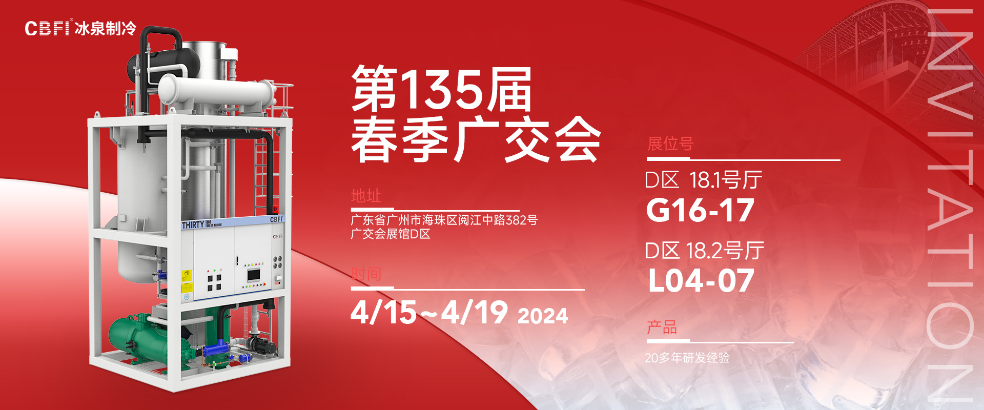 2023年10月15日-19日,第134屆秋季廣交會第一期成功舉辦。冰泉制冷作為連續(xù)多年參加廣交會的企業(yè)之一,本次展會攜螺旋速凍設(shè)備、管冰設(shè)備等產(chǎn)品參展,為客戶提供更加高效高品質(zhì)的成套制冰系統(tǒng)/速凍系統(tǒng)商用解決方案。