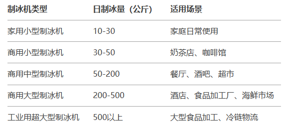 制冰機(jī)的日制冰量通常以“公斤/24小時”為單位,表示機(jī)器在24小時內(nèi)能夠生產(chǎn)的冰量。不同型號的制冰機(jī)日制冰量差異較大,主要分為以下幾類: