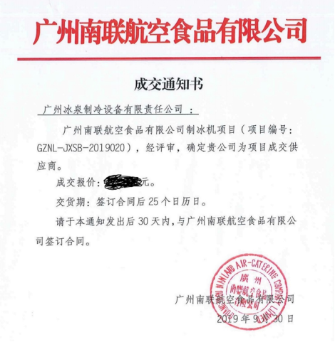 近日廣州冰泉制冷設備有限公司憑借其強勁的綜合實力,以絕對優(yōu)勢中標廣州南聯(lián)航空食品有限公司制冰機競價采購項目。這將意味著冰泉制冰機生產(chǎn)的食用冰粒將飛上1萬米多的高空服務乘客,也意味著冰泉制冰機生產(chǎn)的食用冰粒將和乘客一起在1萬米高空周游世界。廣州南聯(lián)航空食品有限公司作為中外航空公司餐食和機供品服務商,對食品和設備有著極其嚴格的要求,本次成功中標,這是廣州南聯(lián)航空食品有限公司對廣州冰泉制冷公司和產(chǎn)品的充分認可。