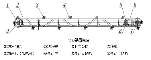 由鋼架、傳動鏈條、傳動鏈輪、減速機和滑塊等部件組成,驅動裝置的電機功率為4KW。片冰機運行期間,耙冰機反向旋轉,將落下片冰儲冰室內水平攤鋪;在儲冰庫出冰循環(huán)過程中,耙冰機反向旋轉,將片冰耙進檔冰板下方的水平輸送螺旋機。耙冰機的高度由升降裝置調整并固定。