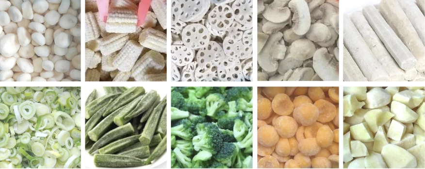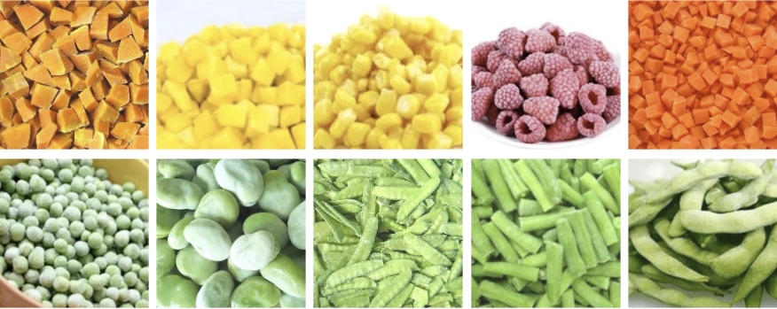 蔬菜類:豌豆、缸豆、毛豆、蠶豆、青刀豆、板栗、玉米粒、蘿卜粒、蒜薹、香菇、秋葵、馬蹄片、蘆筍、筍片、藕片、土豆片、南瓜片、芋頭、山藥、牛蒡、花菜、木耳、洋蔥、大蔥、西紅柿、茄子、青椒、黃瓜、菠菜、芹菜等;