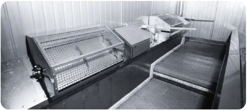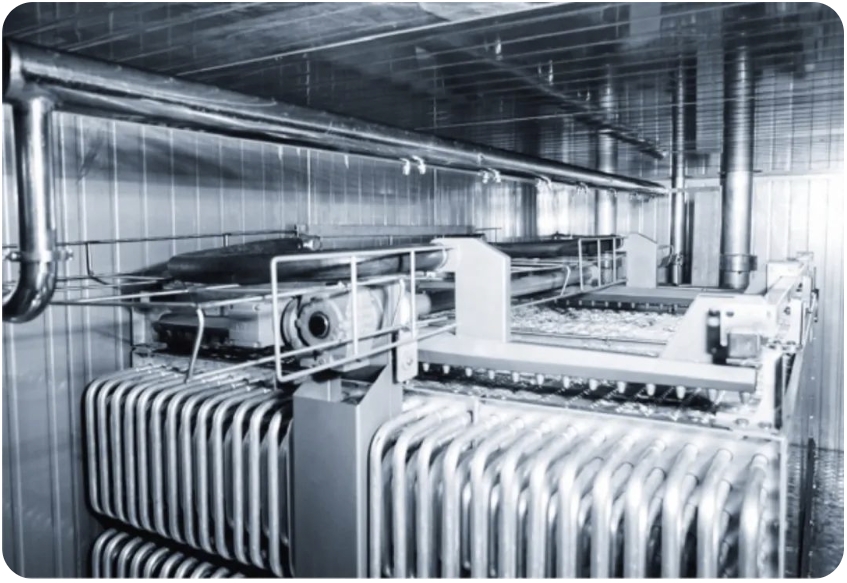 采用低噪音高壓離心風(fēng)機,在網(wǎng)帶下方產(chǎn)生垂直上升的高速高壓低溫氣流,形成流化床。同時延長沖霜間隔時間。