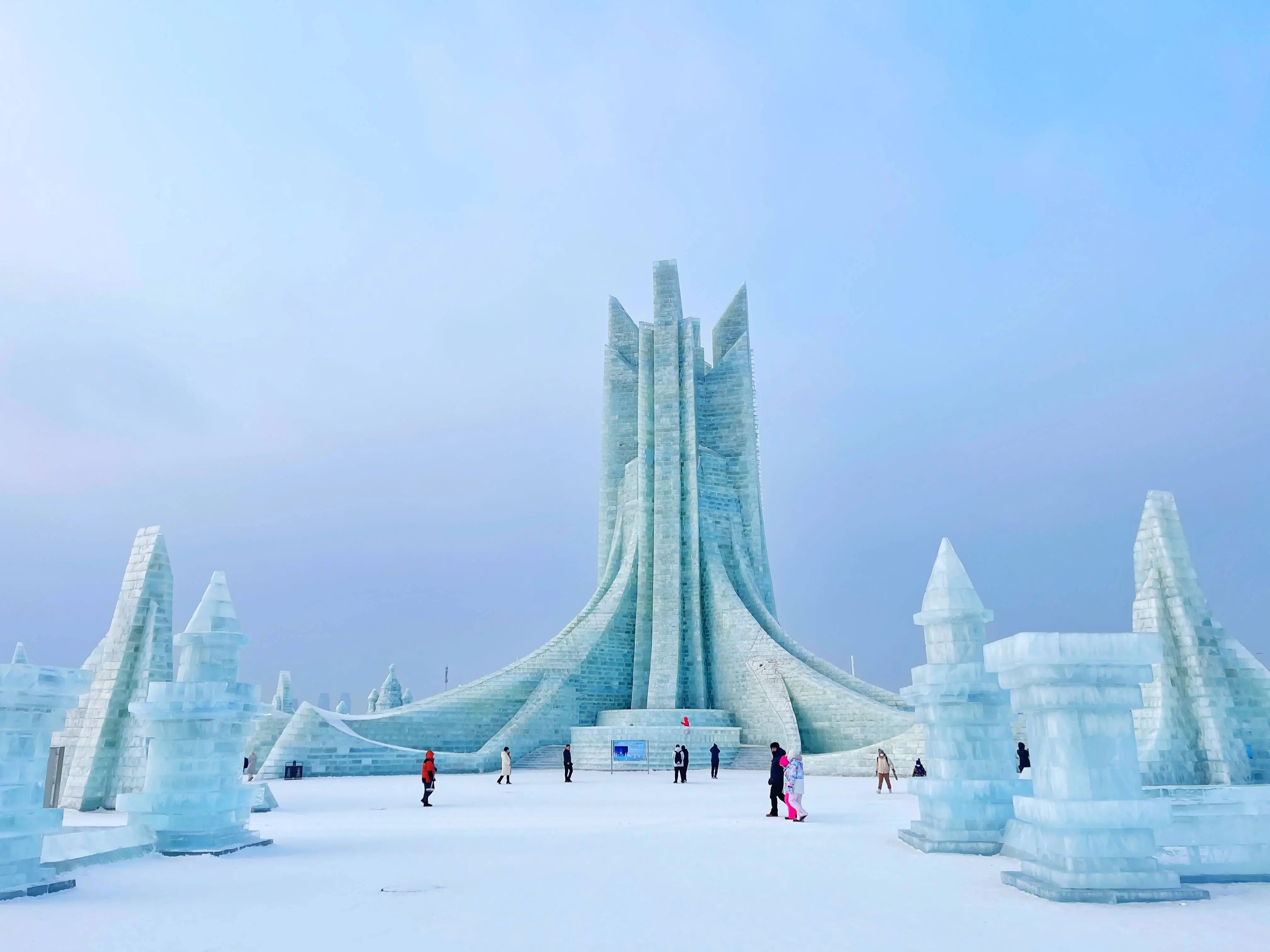松花江的水流穩(wěn)定、水質(zhì)清晰,產(chǎn)出的冰通體透明、密度均勻、裂紋較少,用來建設(shè)美輪美奐的大型冰雕建筑正適合。
