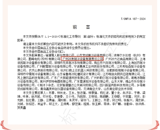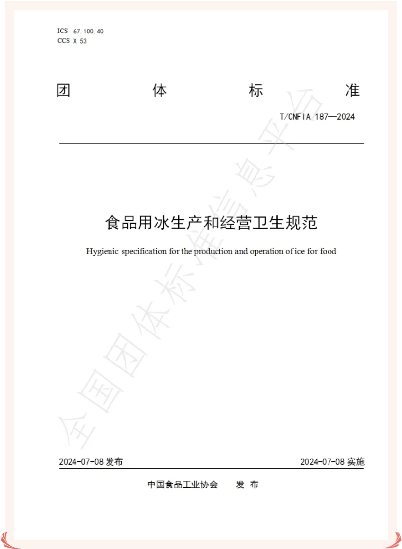 近日,由中國食品工業(yè)協(xié)會(huì)發(fā)布了《食品用冰生產(chǎn)和經(jīng)營衛(wèi)生規(guī)范》(T/CNFIA187-2024,冰泉制冷有幸作為標(biāo)準(zhǔn)起草單位之一,參與該項(xiàng)標(biāo)準(zhǔn)的起草編制。
